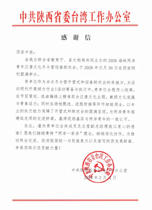 近日,西旅股份旗下西安中旅收到中共陜西省委臺灣工作辦公室發(fā)來的感謝信,對西安中旅全力支持2026海峽兩岸千名大學(xué)生漢唐文化冬令營活動予以高度認可和誠摯致謝。